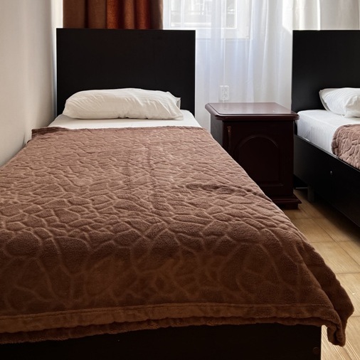 Сатиновое постельное белье, мягкие пледы. Выдаем по 2 полотенца на человека. Жидкое мыло и туалетная бумага в санузле.