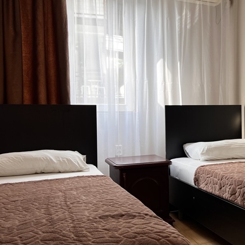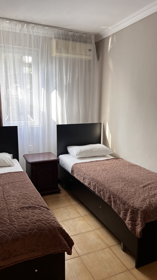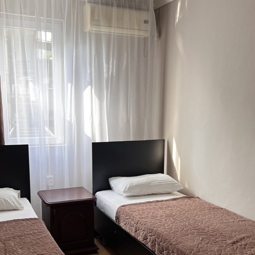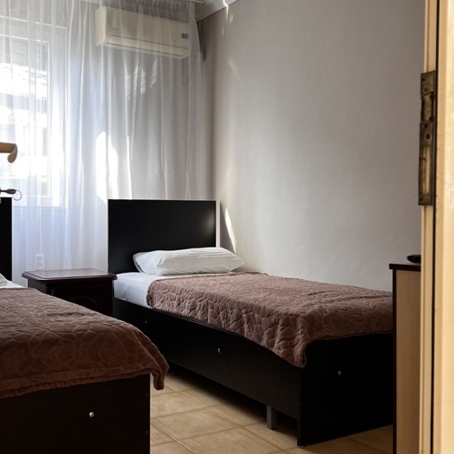 Большой комфортный номер с перегородкой посередине (при желании можно закрыть, чтобы не мешать друг другу). Личный балкон.