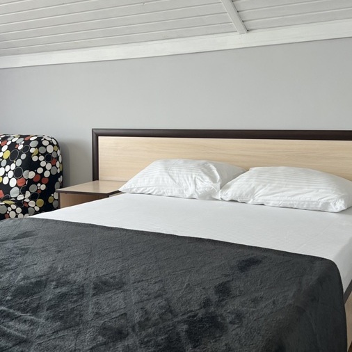 Сатиновое постельное белье, мягкие пледы. Выдаем по 2 белых полотенца на человека. Жидкое мыло и туалетная бумага в санузле с душем.