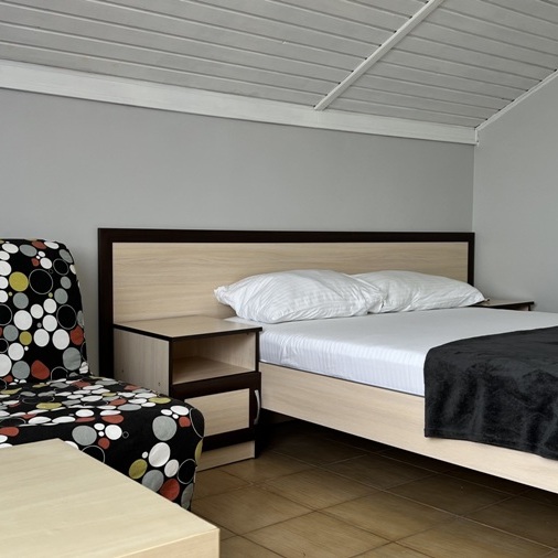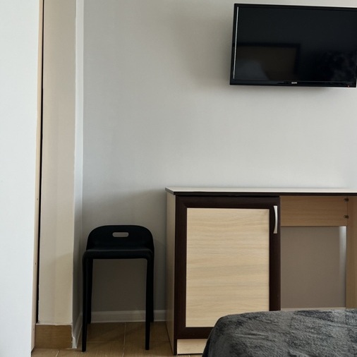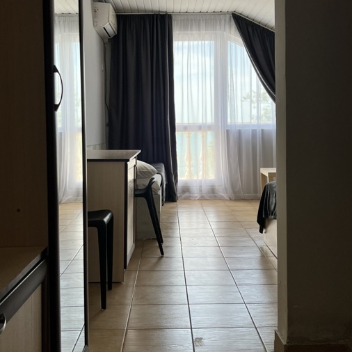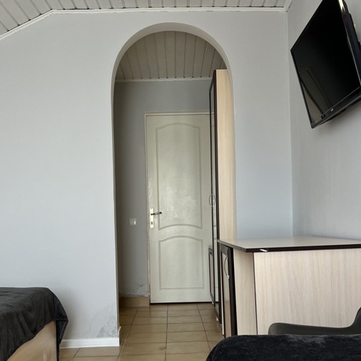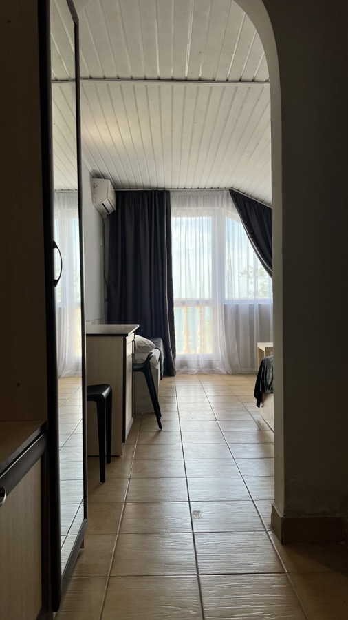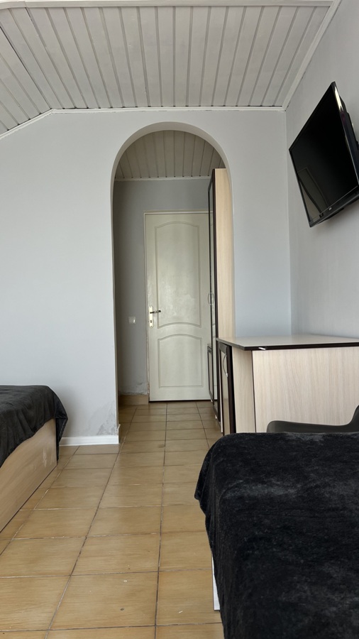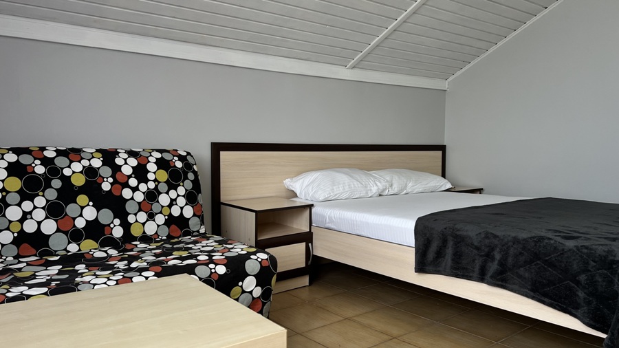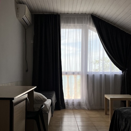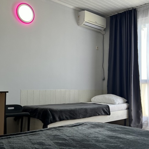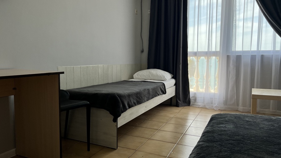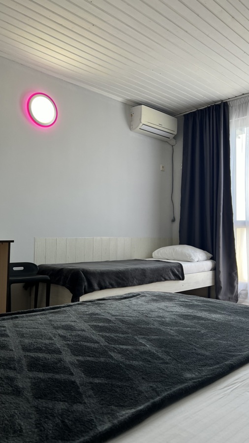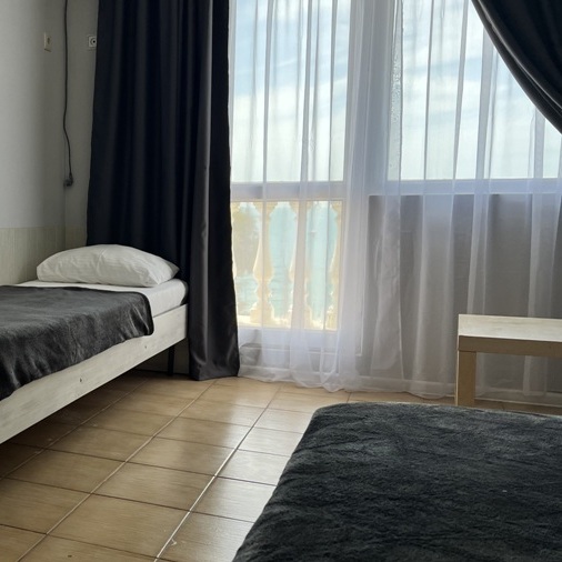 Большой комфортный номер с перегородкой посередине (при желании можно закрыть, чтобы не мешать друг другу). Личный балкон.